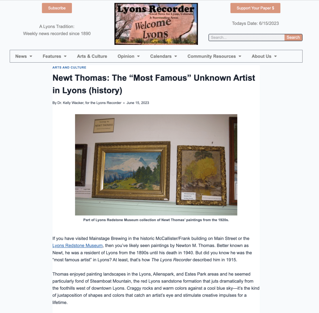 Here’s a little illustration of how valuable this resource is: within hours of the article posting I received a message from a Lyons resident letting me know that I’d misidentified the cliffs above LaVern M. Johnson Park (previously Meadow Park) as Steamboat Mountain. I checked a map to see that the reader was indeed correct! I think I confused a story my grandmother told of climbing the mountain with her brother with with the landscape depicted in the painting. I’m very thankful to be able to correct my error.