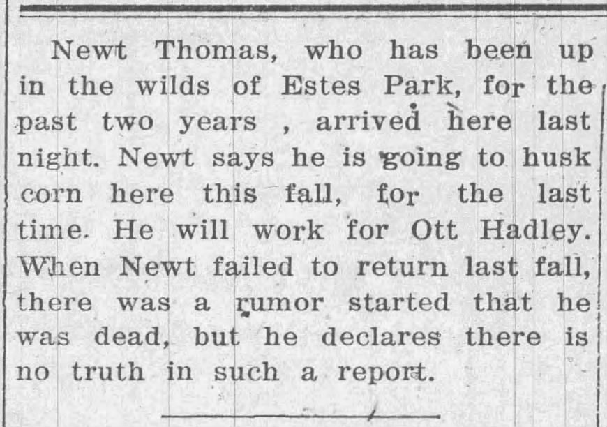 - Newt had a sense of humor. A 1920 article, “Hard Hearted Old Bach” in the Greeley Citizen, apparently reposted from The Palmer Journal, reported, “Newt Thomas writes us from Lyons, Colorado, that he is frying his own pancakes and darning his own socks, although surrounded by good looking widows.”