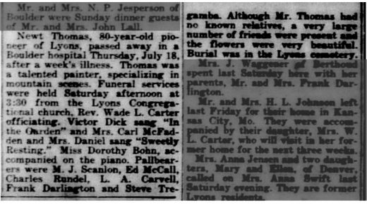 When Newt died in 1940, he was described in the Longmont Times-Call as having many friends but no known family members.