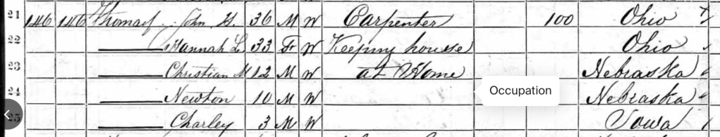 Secondly, I eventually realized I’d been researching the wrong John H. Thomas. The 1860 census records John H., Hannah and their son, Christian living in Pawnee City in Nebraska Territory where Newt and his brother Christian were born. While John Thomas is not an uncommon name, I didn’t consider that there might be two John H. Thomas’ living in mid-19thcentury Pawnee City, Nebraska Territory. The mistake became evident as I began to corroborate biographic data from different sources, comparing census data to Find-a-Grave records.