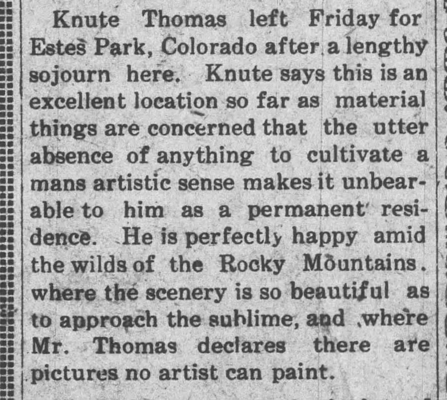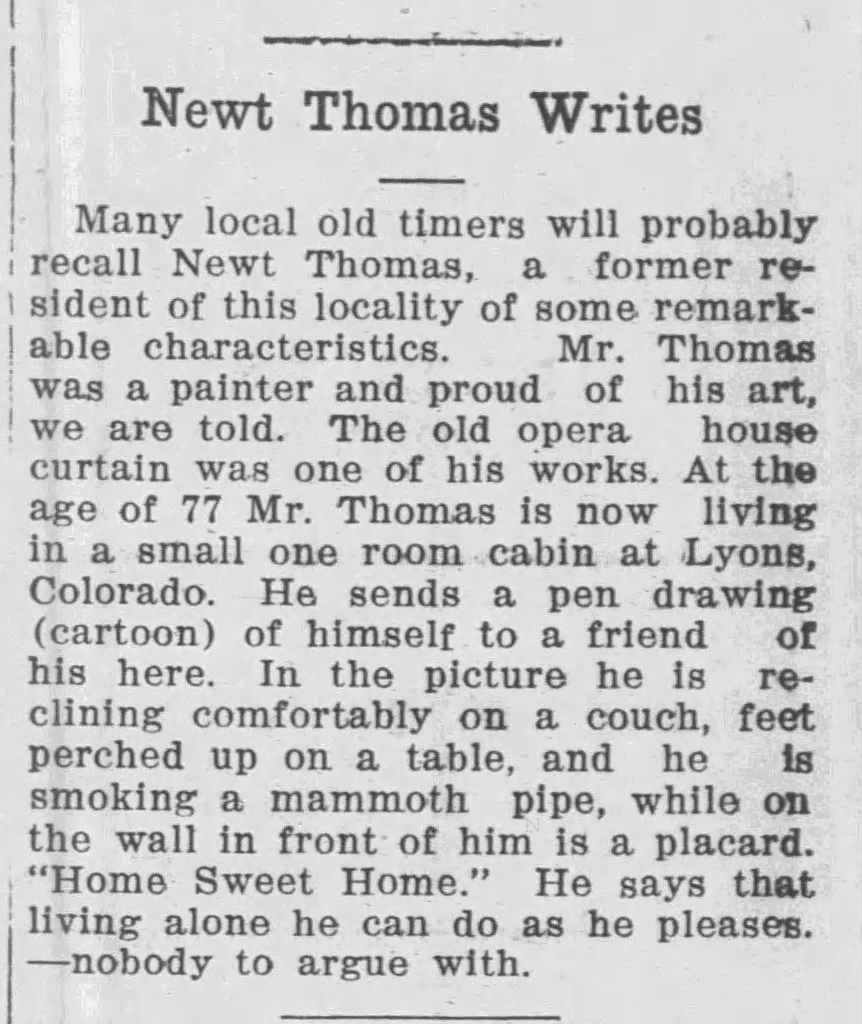 After 1933, aside from an obituary in The Longmont Times-Call and a belated announcement of his death in The Palmer Journal in 1941, Newt appears in a newspaper only once more, in 1938 when The Palmer Journal reported on the receipt of a letter and a drawing from Newt to a friend in Palmer. It seems as if the editor did not know Newt, and his occupation is referred to in the past tense: “Mr. Thomas was a painter and proud of his art, we are told” (emphasis mine).