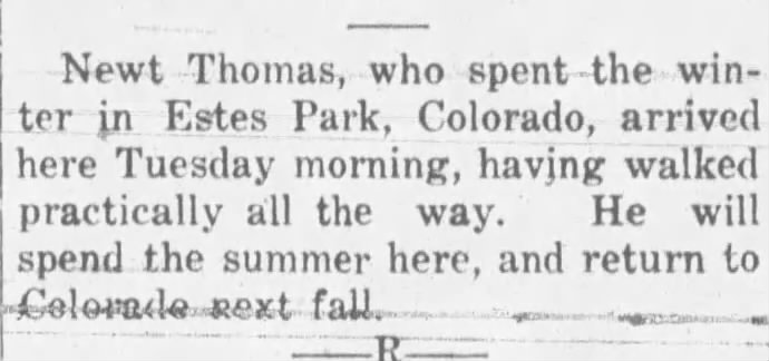 The newspapers, which regularly reported on people’s health conditions, never mention Newt being sick or injured. In fact, Newt seemed to be quite robust. In 1917, The Palmer Journal said he had “walked practically all the way” from Colorado to Nebraska and, in 1933, they reported that he had recently walked from Colorado to Mount Pleasant, Iowa.