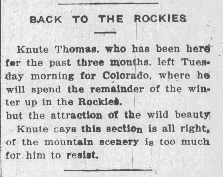 Starting with the Colorado State Library’s Colorado Historic Newspapers database I found Newt indexed twenty-four times. The earliest reference occurred in the 1890 first edition of the Longs Peak Rustler, a short-lived paper published in Lyons. Most Colorado stories are found in the The Lyons Recorder, with the last mention of him being an obituary in the Longmont Times-Call. Oddly, there is no obituary in The Lyons Recorder. The digitized version of the paper in incomplete and it is possible it has not been preserved.