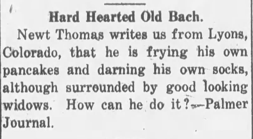Sometimes The Palmer Journal spells Newt’s name as Knute, a personal name of German and Scandinavian origin unrelated to Newton. From context in this and other articles, it’s clear that Knute is Newt, thought the reason for the alternate spelling in unknown. Given that the region was settled by many Germans and Scandinavians, the alternate spelling might be typographical error, or perhaps the typesetter was running low on “w” or “e” type and opted for a recognizable phonetic replacement.