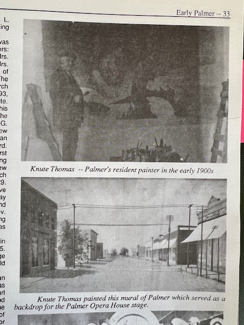 General internet searches turned up the Merrick County History Museum located in Central City, located about 20 miles from Palmer. I contacted the museum, explained the project, and asked if they had any information about Newt. I received a warm reply from the director, Schavon Cordsen, and a copy of a page from the Palmer history book with a photograph of Newt painting and the painted opera house backdrop!